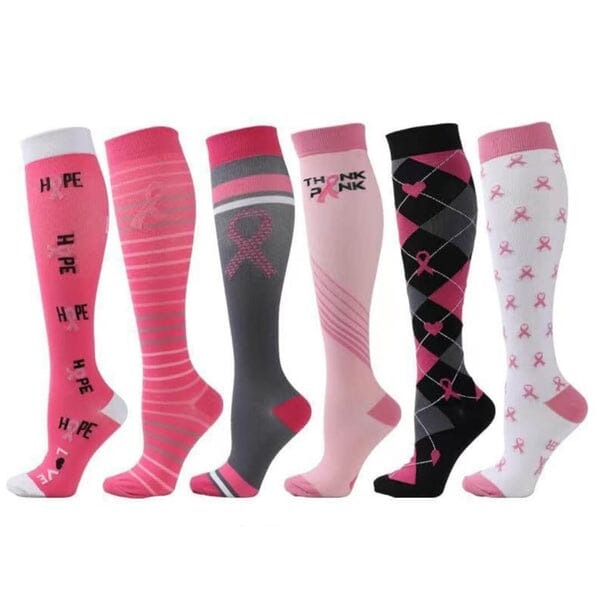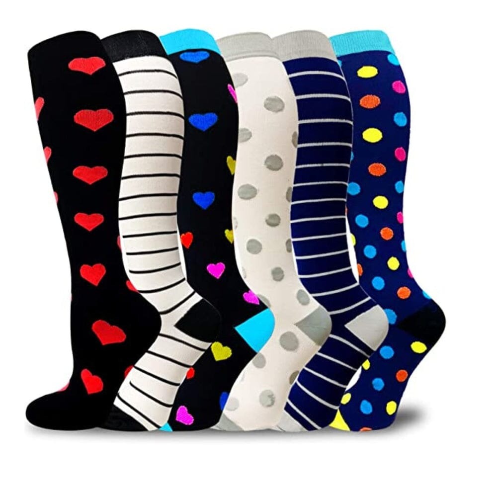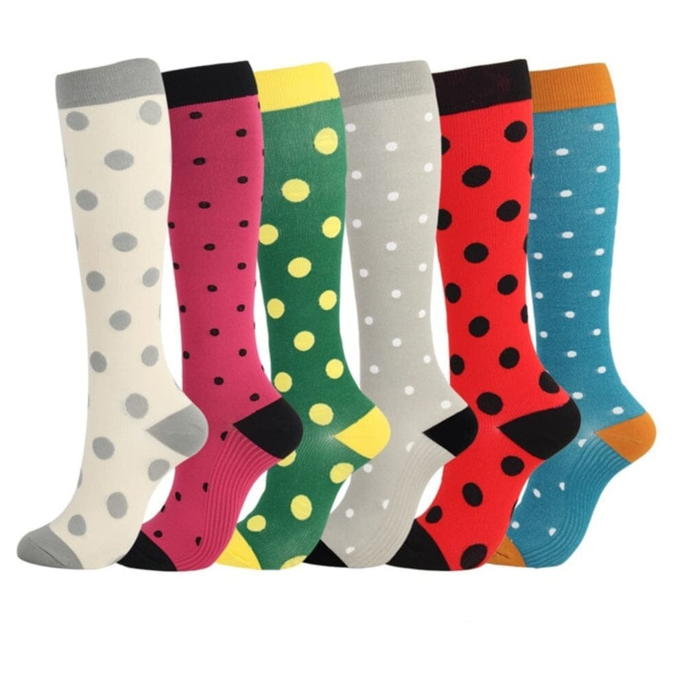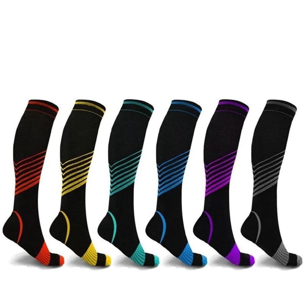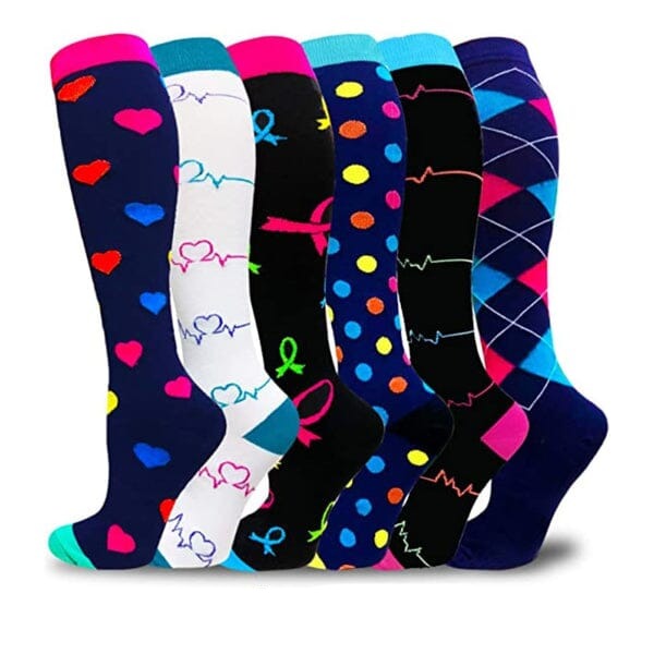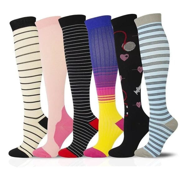 Trate as veias varicosas com as nossas meias de compressão coloridas! A compressão começa mais forte ao redor do tornozelo e se solta até o joelho para estimular o fluxo sanguíneo adequado.